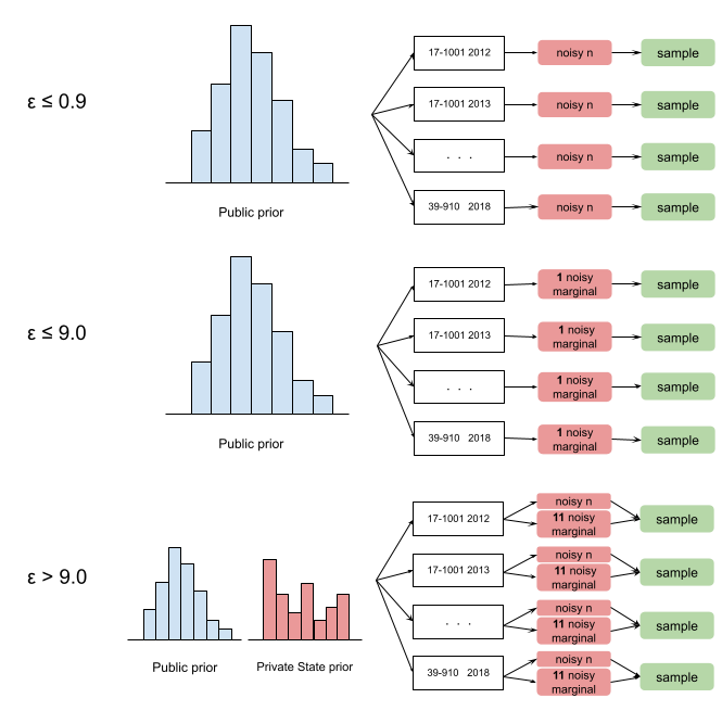 We apply an adaptive strategy for releasing the synthetic dataset for each puma-year group. When epsilon is high, we use 10 percent of the privacy budget to learn the selected high-way marginals over the entire state to adjust the prior distribution for each state, and then use the remaining 90 percent of the privacy budget to learn the selected one-way marginals to adjust the prior distribution for each puma-year. The marginals are selected based on maximum independence, maximum variation and minimum domain size principle. The prior update is related to the maximum entropy principle. When epsilon is low or moderate, we do less update to the prior.