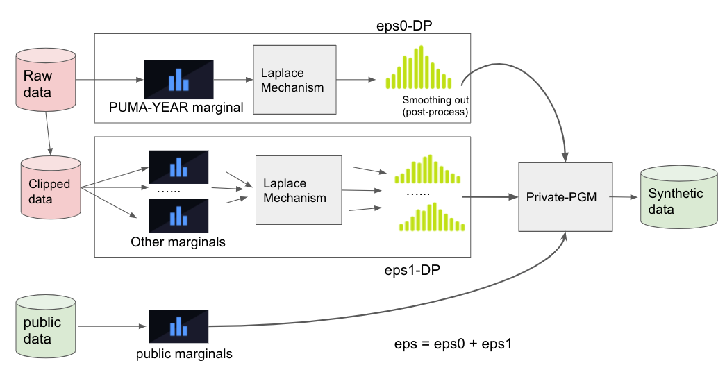 We used PGM inference to generate the synthetic data. Both noisy measurements and public measurements were used as an input for the Private-PGM which estimates graphical models to approximately match those marginals. Depending on epsilon, we carefully decided what pairs and how many pairs of marginals to measure privately and what attributes to measure from the public provisional dataset. To reduce sensitivity, we clipped the raw data where the number of clipped records were also decided based on the public data.
