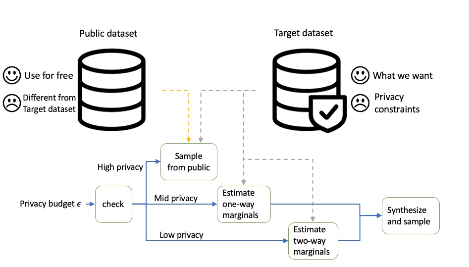 We used the public dataset to select a set of marginals that contain highly correlated attributes. Then, we inject noise to those marginal to achieve differential privacy, and used those marginals to construct a Markov random field (MRF). Finally, we use the MRF to generate synthetic data.