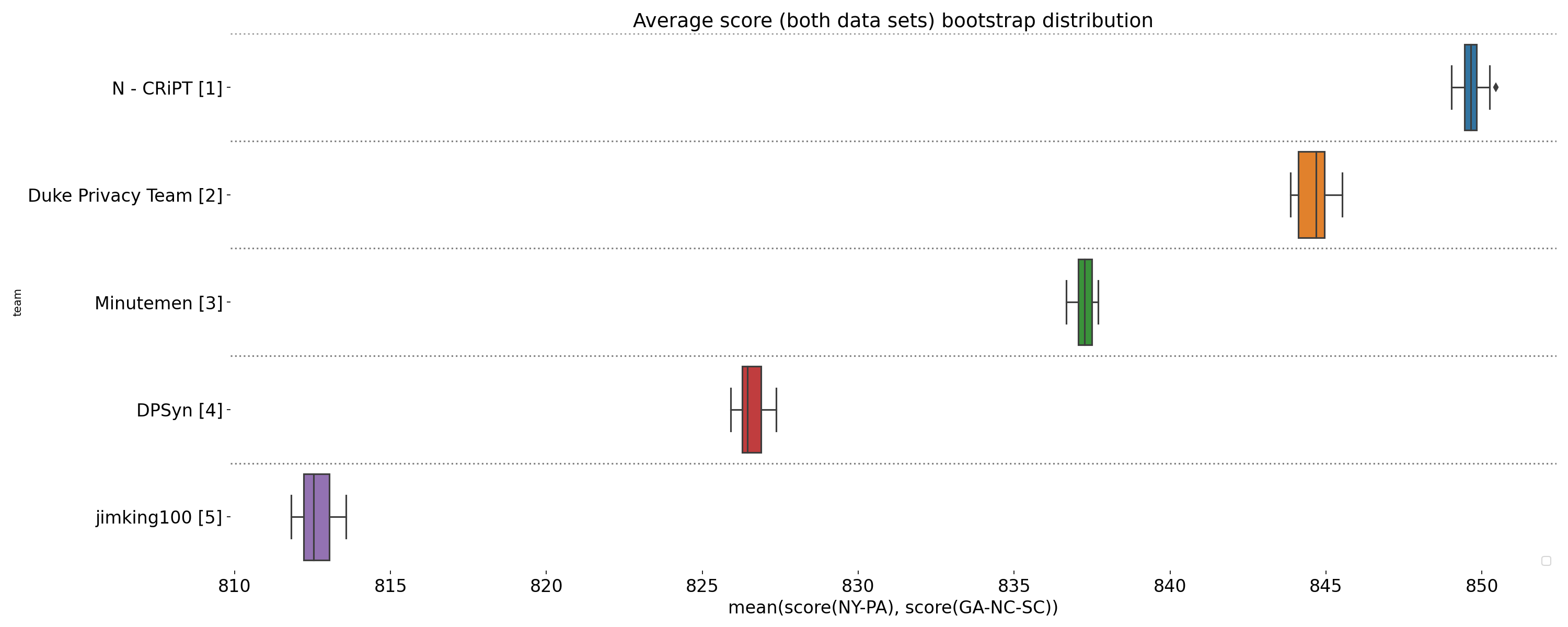 Visualization of boxplots showing the final score distribution for four runs on each sequestered data set (NY-PA and GA-NC-SC), displayed for teams whose solutions were validated as differentially private. Each run uses 3x as many k-marginal iterations as in the Development Phase.
