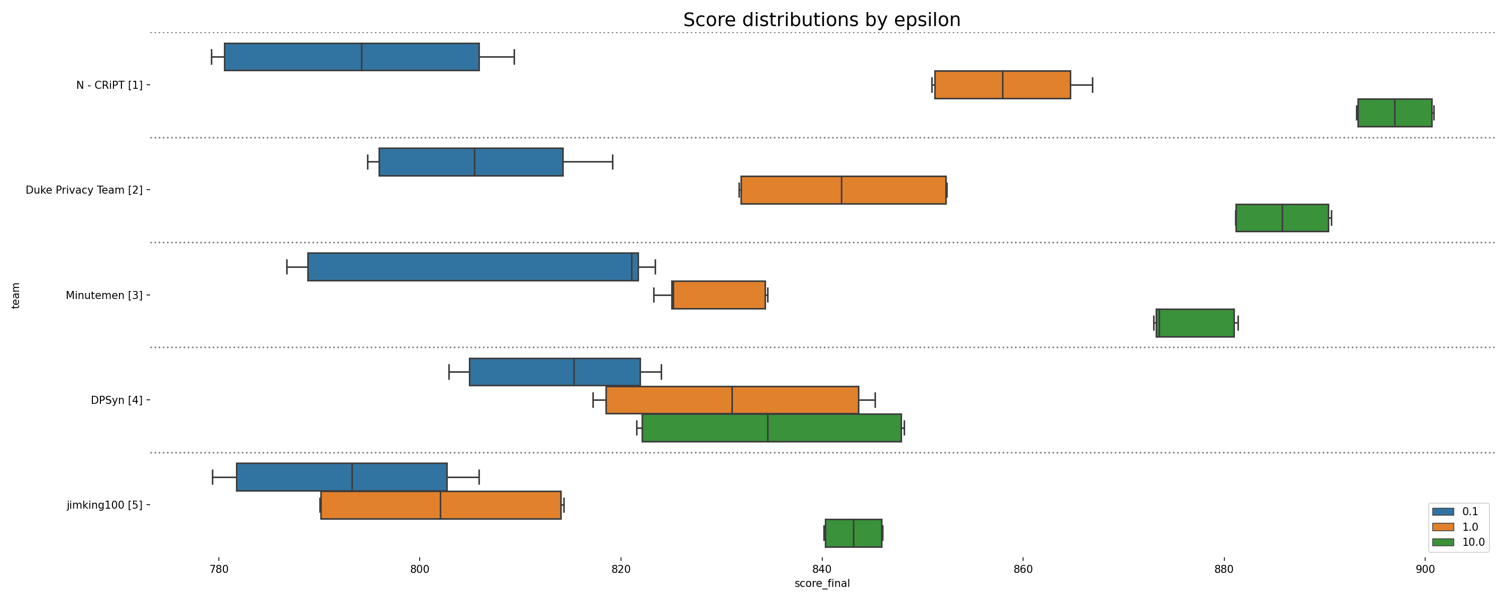 Scores grouped by epsilon (privacy parameter) for four separate runs on each final scoring dataset. The box represents the 25th, 50th (median), and 75th percentiles, while the whiskers represent 1.5 times the interquartile range.
