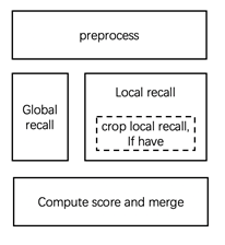 For the Matching Track task, we use a global+local recall method. The global recall model is EsViT, the same as task Descriptor Track. The local recall used SIFT point features (about 600 million features for reference images resize to 300p). And then compute match score of all recall pairs by SIFT feature + RANSCA and merge them (score add). As shown in the figure: