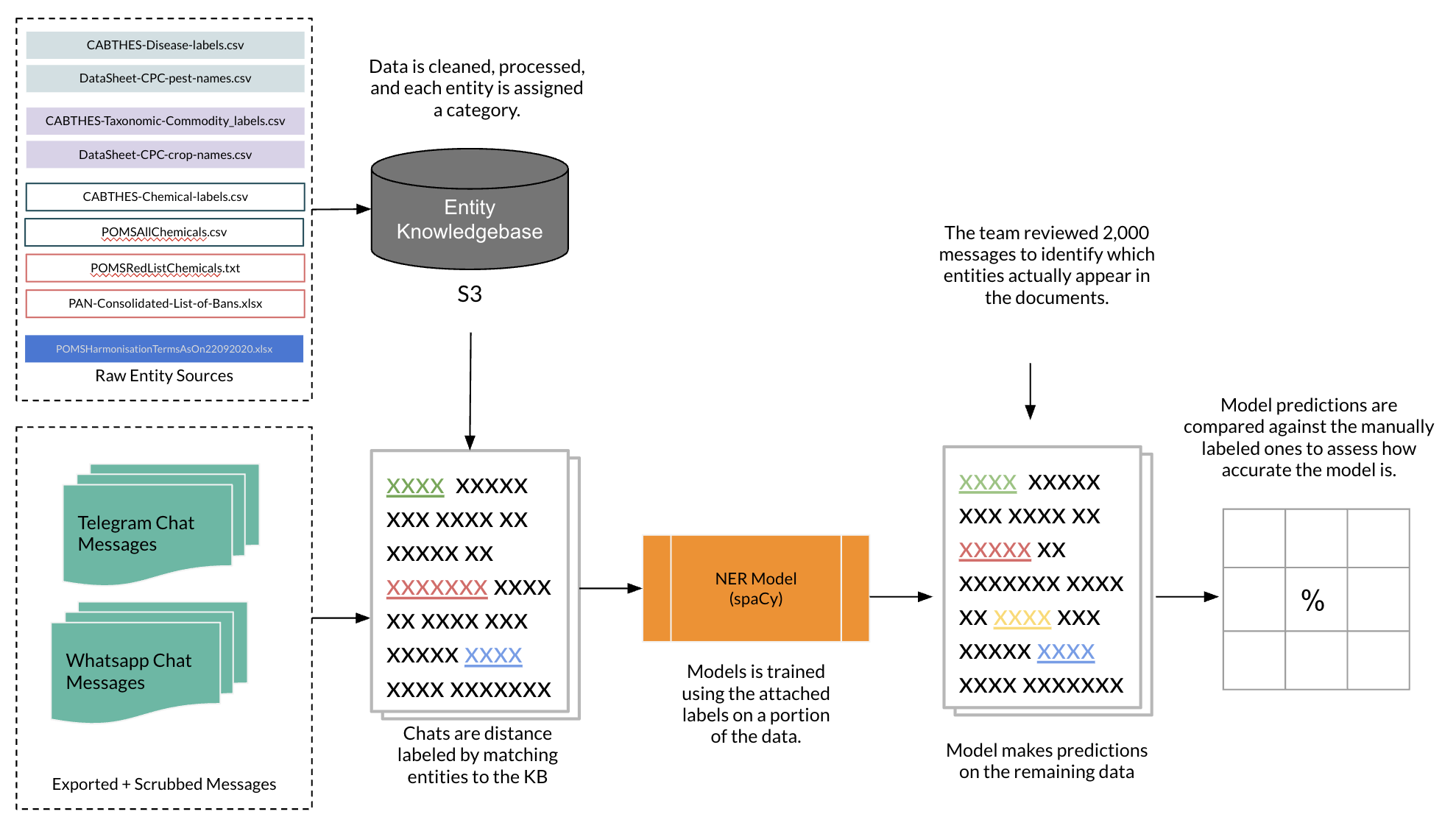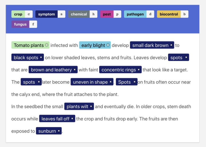 This project was focused on prototyping methods for entity extraction: the process of automatically identifying and digesting the agricultural units that users are discussing such as plants and pests.